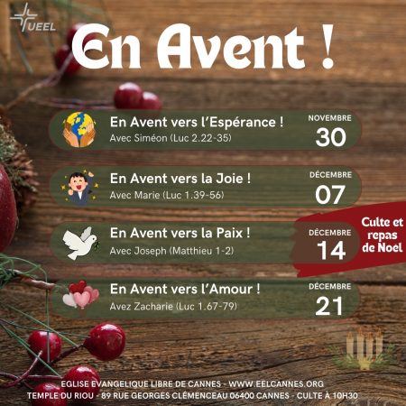 A l’Eglise Libre de Cannes, nous allons donc célébrer ce temps de l’Avent, en quatre temps (en se souvenant des quatre bougies traditionnelles) :